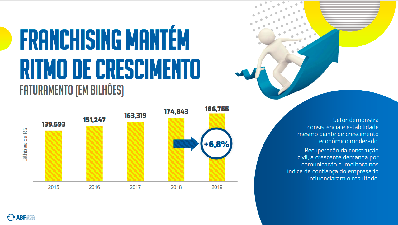 Uma simples análise dos relatórios apresentados pela ABF (Associação Brasileira de Franchising), mostra o quão promissor é esse mercado e como ele cresceu nos últimos anos, veja no quadro abaixo que de 2018 para 2019 o crescimento real foi de 6,8%.